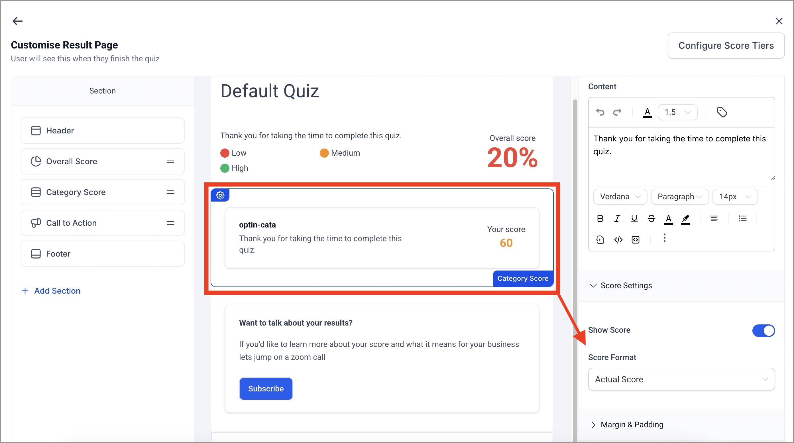 💡 NOTE: No need to duplicate answer text: The visible text comes from your Custom HTML. In the default option, focus on Category and Score. Just keep the position aligned: