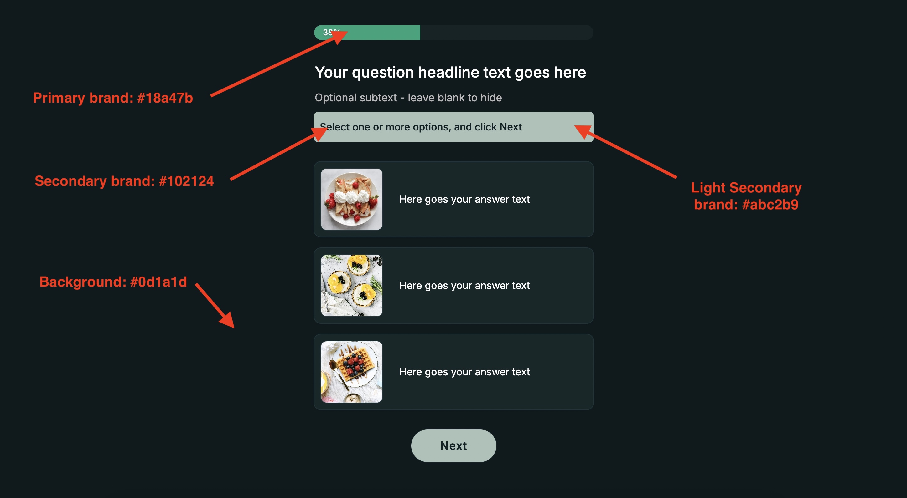This is the only section most users need. This section contains all the variables you need to adjust the quiz look to your brand. Other colors are derived from the 4 core colors you set, so you’ll rarely need to touch anything else.